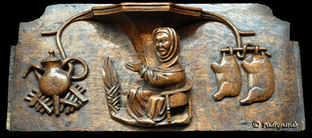 Left : Izquierda: Cristo sentado con un libro en la mano con una cabeza con hojas en la frente y alrededor de la boca. Las hojas en la frente se refieren a la palabra escrita, los cuatro evangelios, el libro. Las hojas alrededor de la boca se refieren a la palabra hablada como es expilicado por E.L. Hoffman-Klerkx en la revista "Oud Utrecht" año 67 número 2 marzo/abril 1994. También aquí el Hombre Verde tiene un significado claro y en absoluto es un símbolo de la fertilidad, como se dice a menudo. Haga clic aqui para más. |
